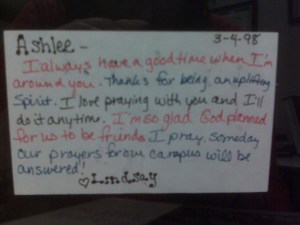 That would be exciting enough, but I have to add a personal note. One of the many things that Molly and Jessica have learned through their semester in prayer is that there have been others before them that have prayed fervently for our campus as well. I know of a group of students in the spring of 1998 who prayed in that very chapel for God to be present on our campus in a new way. They prayed and they sang, and they stayed up way too late talking about how God was at work on their campus. I know that there was a group in 1998 because I was one of that number. The note above is a note given to me by a friend who also prayed.